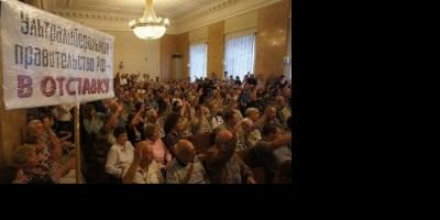 Санкт-Петербург, Июль 01 (Новый Регион, Екатерина Изотова) – Из-за проливного дождя в Петербурге митинг в защиту РАН перенесли из сквера в актовый зал учреждения академии на Политехнической, 26. В акции приняло участие около 300 человек. Активисты принесли на митинг плакаты «Роснауксервис – спасибо, не надо», «Романовы академию создали, Медведев с компанией убивают, «Правительство в отставку», «Академики, протестуйте – это ловушка», «Ломать не строить, опомнитесь!".